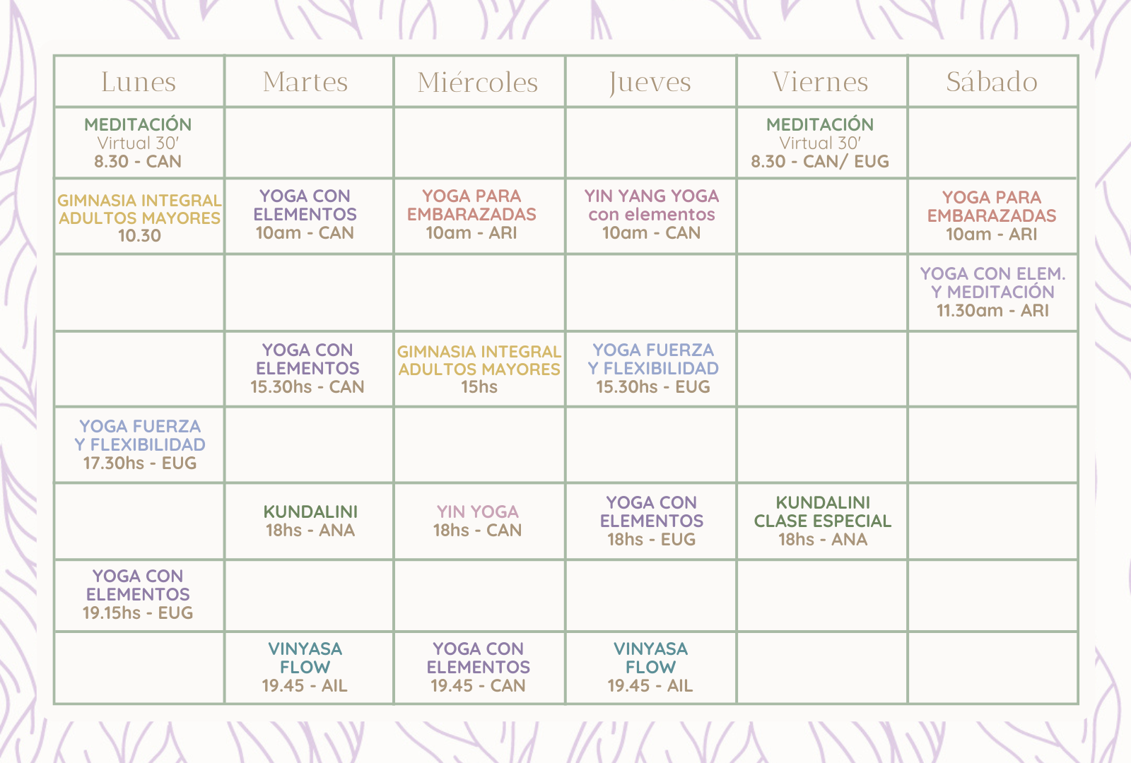 A continuación, encontrarás la grilla de horarios con el día, el horario, el estilo y la profesora de cada clase.